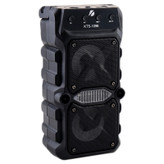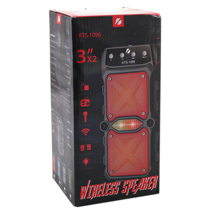 اسپیکر پرتابل KTS 1096 را می توان به شکل ایستاده به کار برد و علاوه بر بلوتوث، با کارت حافظه، فلش مموری و AUX سازگاری دارد. اسپیکر بی سیم KTS مدل 1096 حتی به ورودی میکروفون نیز مجهز شده است و همچنین وجود دو ساب 3 اینچی باعث شده است تا بتوانید قدرت صدای شگفت انگیز آن را برای تمرین آواز نیز به کار ببرید. ویژگی شگفت انگیز دیگر این اسپیکر، وجود رقص نوررنگی در هنگام پخش موزیک است. با اتصال یک میکروفون به اسپیکر میتوانید کارائوکه را با دوستان خود در هر مکانی تجربه کنید. قابلیت ویژه دیگر اسپیکر 1096 وجود فناوری TWS یا همان اتصال همزمان دو دستگاه برای قدرت صدای بیشتر می باشد. برای اتصال همزمان دو دستگاه به گوشی موبایلتان کافی ست دکمه M برای چند ثانیه نگه دارید تا ارتباط برقرار شود. درایورهای داخلی این بلندگو بی سیم، قدرتی برابر 10 وات برای آن رقم می زنند و با هر بار شارژ کامل باتری 800 میلی آمپر ساعتی آن امکان 3 ساعت پخش مداوم موزیک در اختیارتان خواهد بود. از ویژگی های دیگر اسپیکر وایرلس کی تی اس مدل 1096 می توان به رادیوی FM، برد 10 متری و پخش صدای استریو اشاره کرد.